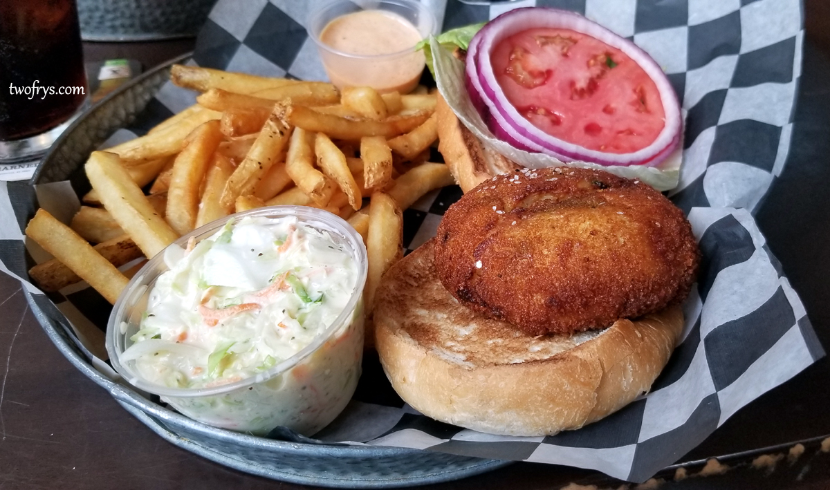 | Crab cake sandwich, French fries, coleslaw, and spicy remoulade |